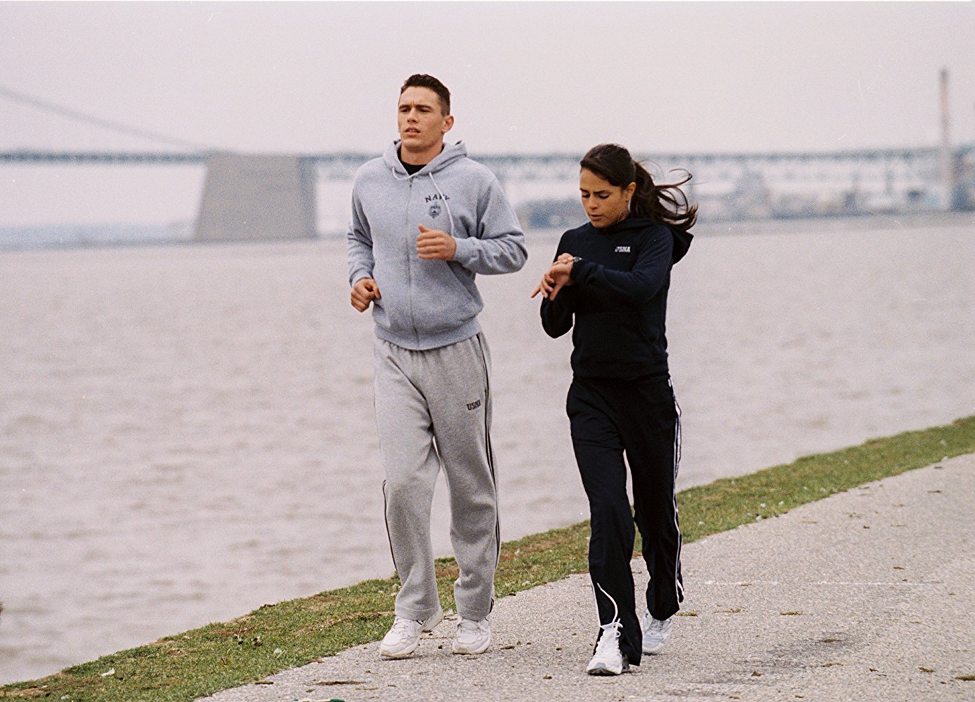 What “Annapolis” is, is the story of a kid who grew up in the shadow of the Naval Academy at Annapolis, MD, with dreams of his own and his mother’s that he would someday attend. The son of a shipbuilder, “Jake Huard” (James Franco) had his determination to get into Annapolis harden into a steel resolve when his mother died. His shipbuilder father (Brian Goodman) discourages his dream, for two reasons. One, because he doesn’t think that Jake has what it takes to succeed within the rigors of the Navy’s Academy Program, and two, because he happens to be Jake’s boss in the shipyard where they both work and he doesn’t want to see Jake throw away a promising career as a riveter.