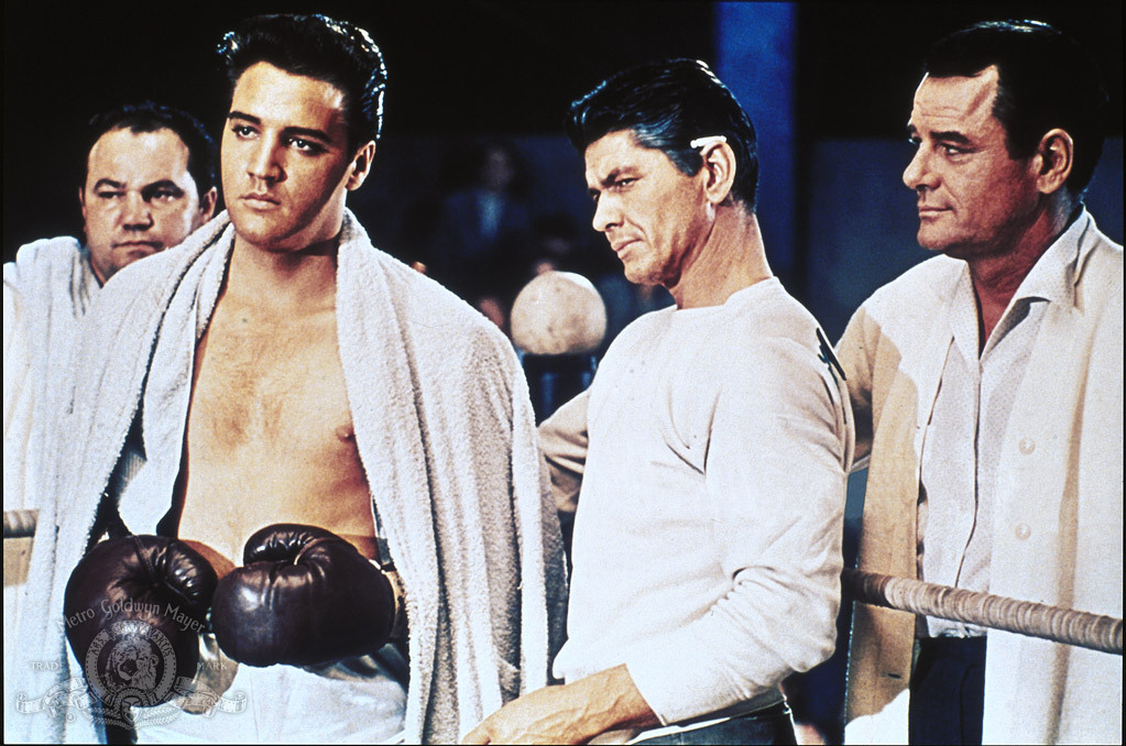 Kid Galahad was a remake of a 1937 film of the same name. “Walter Gulick” (Elvis) takes a job near a quiet resort in the Catskills as a mechanic. He agrees to act as a sparring partner for one of the boxers being managed by “Willy Grogan” (Gig Young) and winds up knocking the boxer out. They tag Walter with the nickname “Galahad” and “Lew” (Charles Bronson) begins training him. A young Ed Asner is also in this movie.